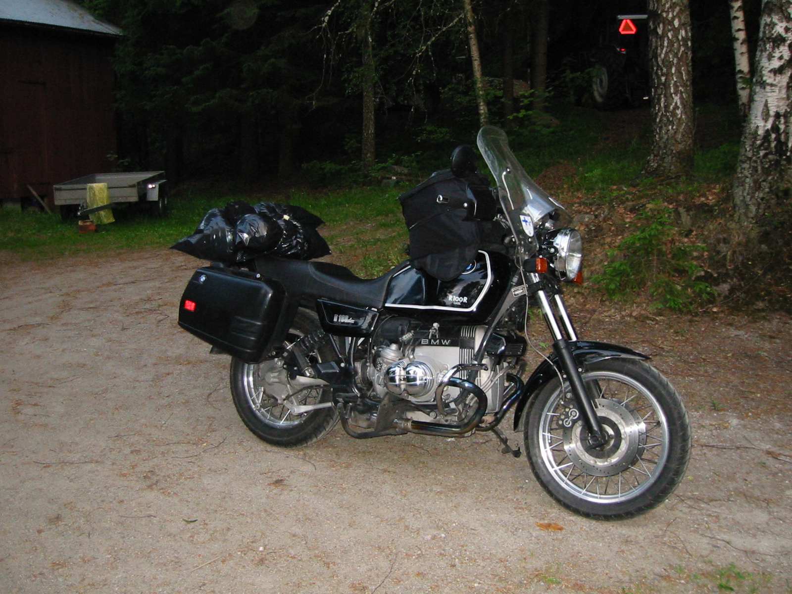 Siinä on E4:n remontissa ja alaspäin menevä liikenne on ohjattu viereiselle kaistalle. Kaistojen väliin oli laitettu noita n.metrinkorkuisia pujottelukeppejä ja pientareen puolella tasaisin väliajoin peltipönttö josssa vuoronperään ohituskieltomerkki ja 70 nopeusrajoitusmerkki. Taakse ilmestyy auton valot ja kaveri pyytää valoilla ohitusmahdollisuutta, yritin katsella mahdollista väistöpaikkaa, mutta oma nopeuteni oli jo 80:n nurkilla ja tienpinta uutta asfalttia ja märkää sateen jäljiltä. Pientareen valkoinen viiva juuri maalattu ja märkänä liukas eli en halunnut enää tässä vaiheessa ottaa mitään riskiä. Seurasi jo toinen valojakso, johon heilautin kättä jotta kaveri tietää minun huomanneen, vaan eipä pinna pojalla kestänyt. Pakko oli lähteä niiden pujottelukeppien välistä vastaantulevan puolelle ja kiihdytys minun kohdalle jolloin liinat kiinni ja päälle. Kyllä siinä heräsi klo 02:00n aikoihin todella nopeasti ja onneksi refleksit toimivat vaikka jonkin aikaa aikaisemmin olin jo hieman epäilevällä päällä. Siinä niissä sekunnin murto-osissa näin auton sisälle, että kaksi nuorta "vaaleaa" viikinkiä siellä istui, tiedä sitten oliko turkkilaisia vai kurdeja, mutta sen tiedän mitä heillä oli päässään. Takaa tuleva rekkakin jo ilmaisi moisesta mielensä. 1300 kilometriä takana .... hei ei tää niin kivaa ole enää. Tukholma lähestyy aurinko alkaa nousemaan ja suoraan naamalle tietty. Tuossa näkyi peuran vasa vasemmalla syömässä kaurapellossa, jossain lähellä varmaankin on sitten emokin, alkaa jo meitsi hyräillä kypärän sisällä että 'hirvi älä tule tielle ...jne.'.